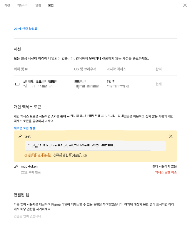 Figma에 가서 프로필- 설정 - 보안 - 새로운 토큰 생성 (복사)