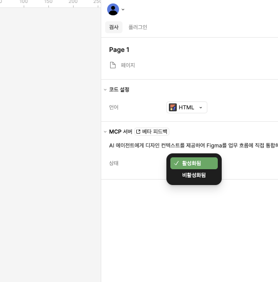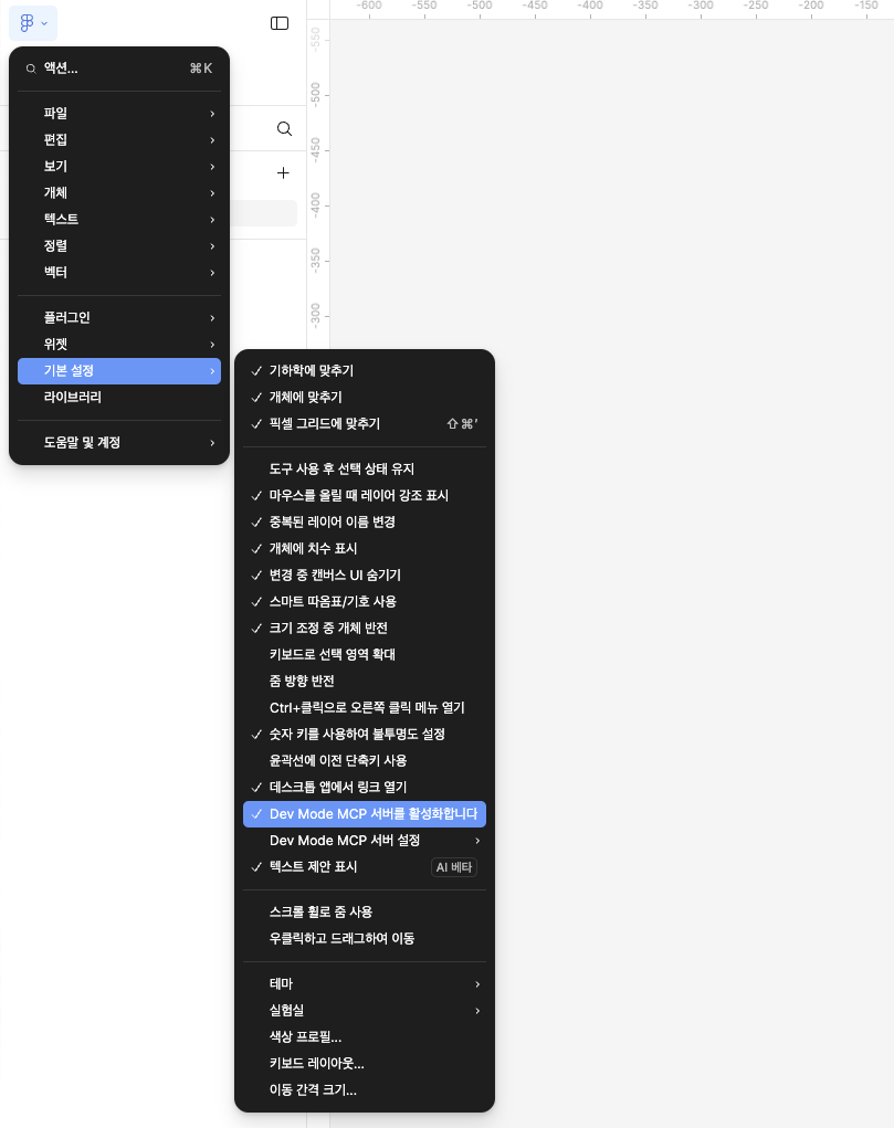 1.1 - Figma - 새디자인 파일 좌측 상단 피그마 로고 눌러서 - 기본 설정 - Dev mode MCP 모드 활성화