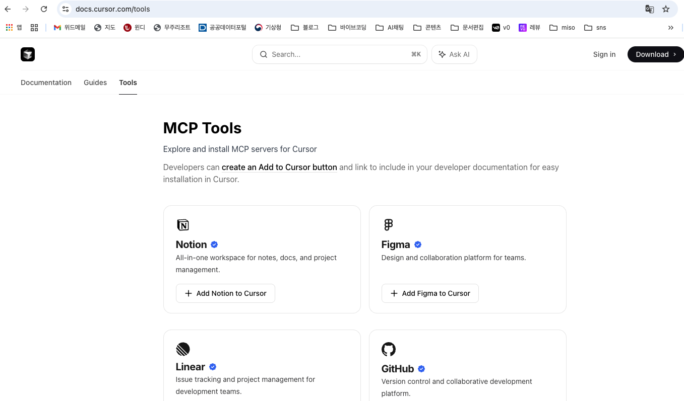 2. Cursor 공식 툴 사이트 들어가서 - Figma "+Add Figma to Cursor" 클릭