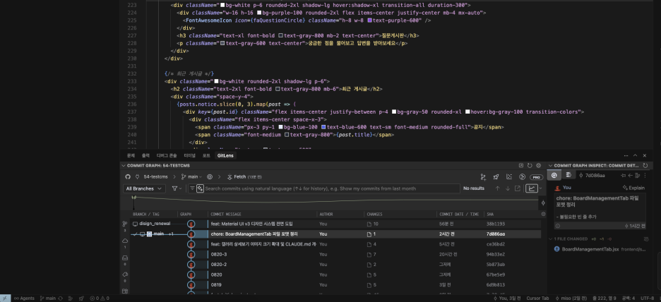 하단의 GitLens 탭을 선택해서 직관적인 깃허브 작업을 보면 사용